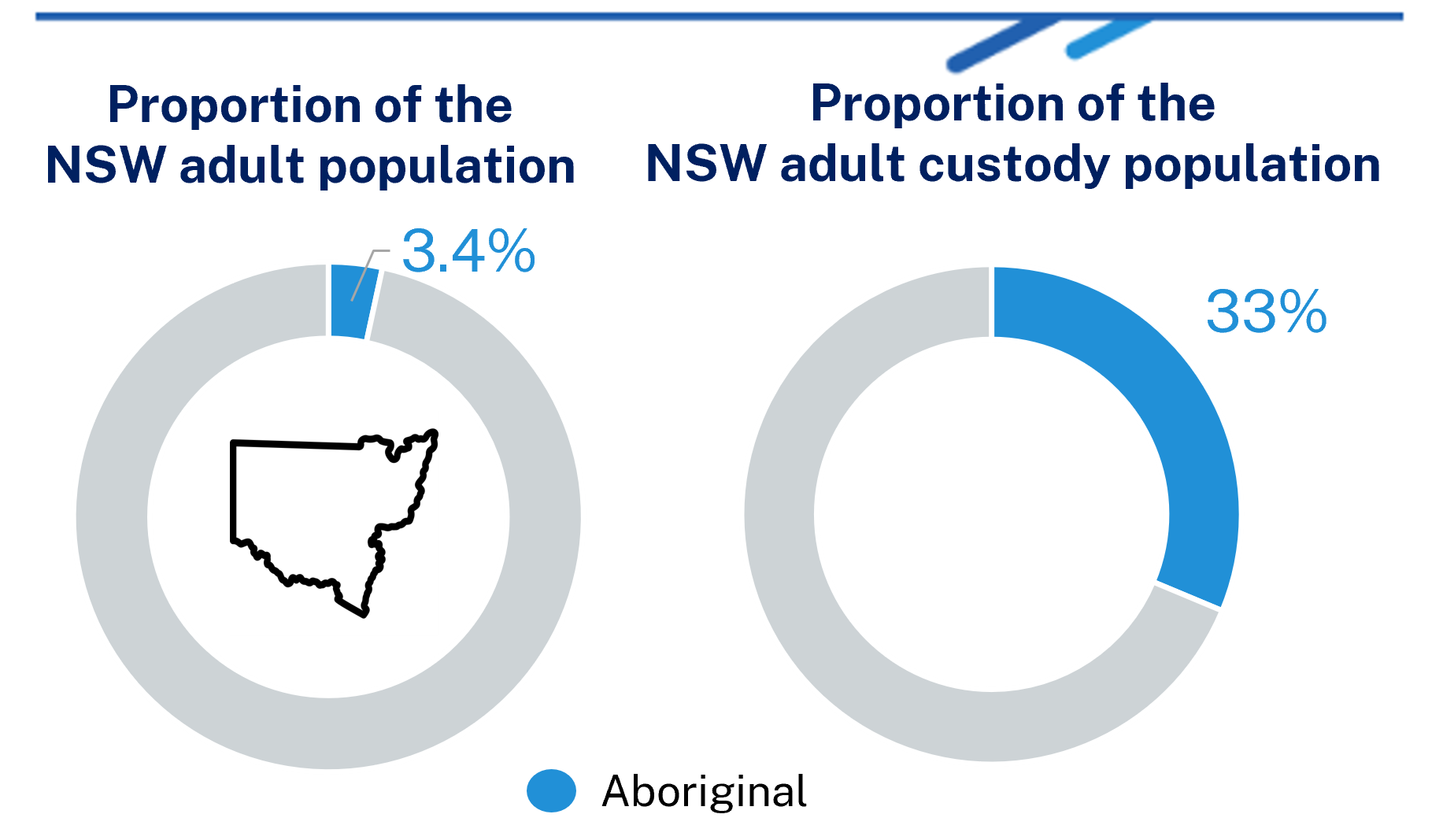 Aboriginal people are disproportionately represented at each stage of the Criminal Justice System. Aboriginal people constitute just 3% of the NSW adult population and 8% of the NSW population aged 10-17 years but comprise more than 30% of the adult prison population and 50% of the youth detention population.