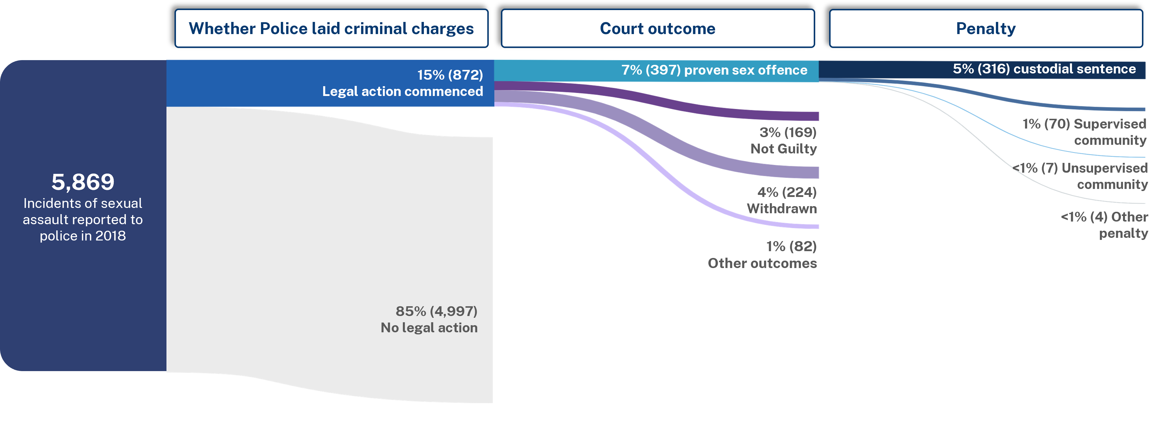 The infographic shows the number of sexual offences at various stages of the criminal justice process, from the initial police report to final sentencing.